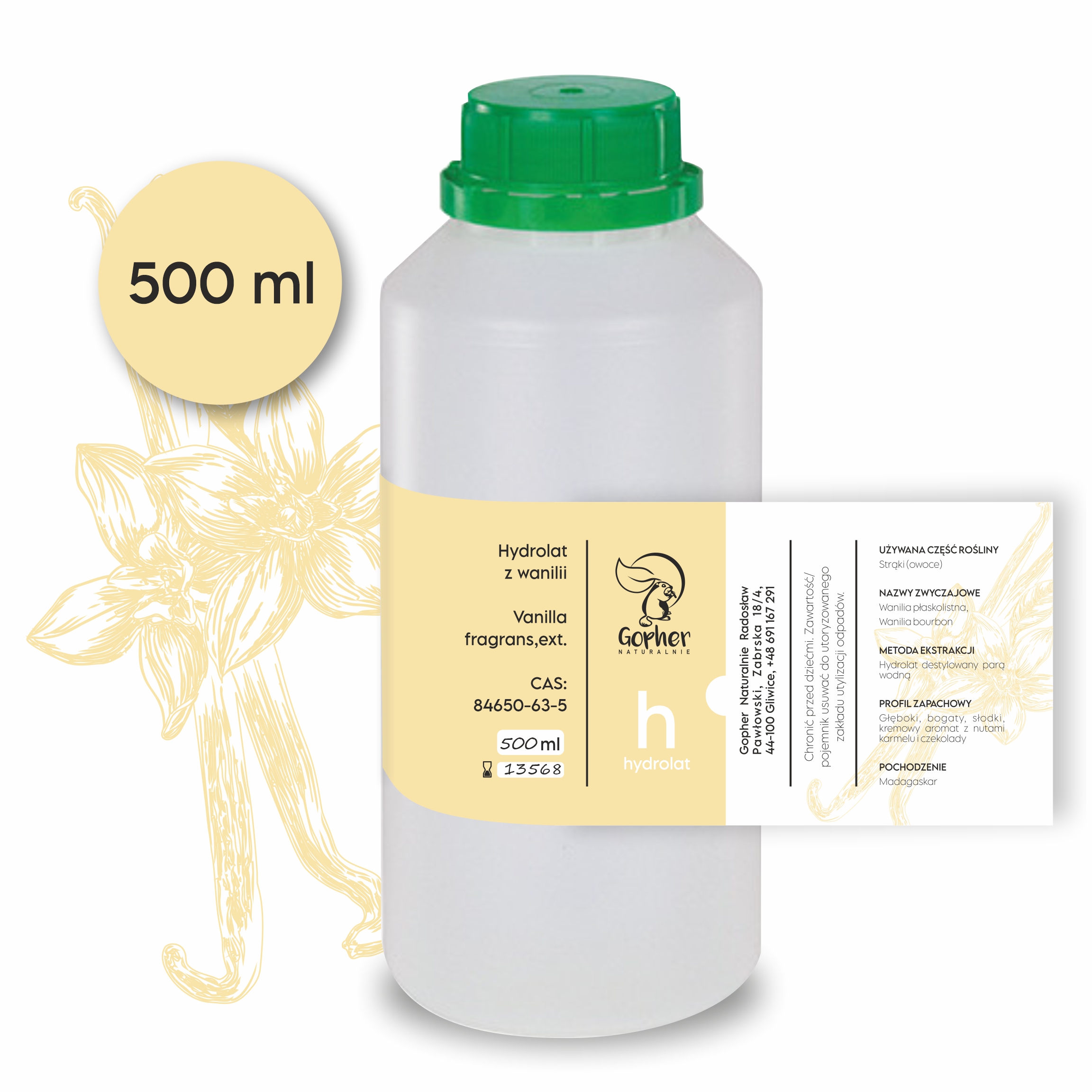 Hydrolat Waniliowy to naturalna, delikatna woda roślinna otrzymywana w wyniku destylacji strąków wanilii płaskolistnej (Vanilla planifolia) pochodzącej z Madagaskaru. Charakteryzuje się głębokim, ciepłym, słodkim zapachem z kremowymi nutami karmelu i czekolady, który działa kojąco na zmysły oraz sprzyja relaksacji.